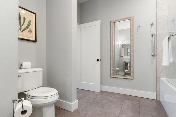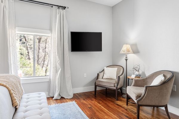 Located upstairs, this room has a California King sized bed and conversational seating area. The kitchenette includes a mini fridge, sink, microwave, coffee maker and electric tea kettle. The bathroom has heat-controlled tiles, dual sinks and vanity mirrors and a shower and bathtub combination. Additional features include on-demand hot water heating, and the beauty of original hardwood flooring.